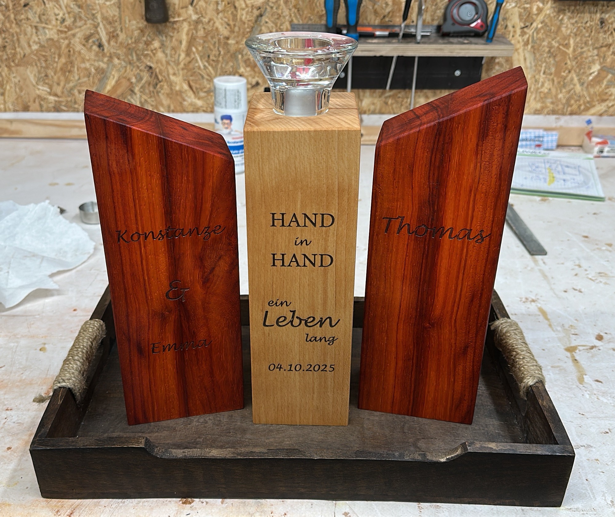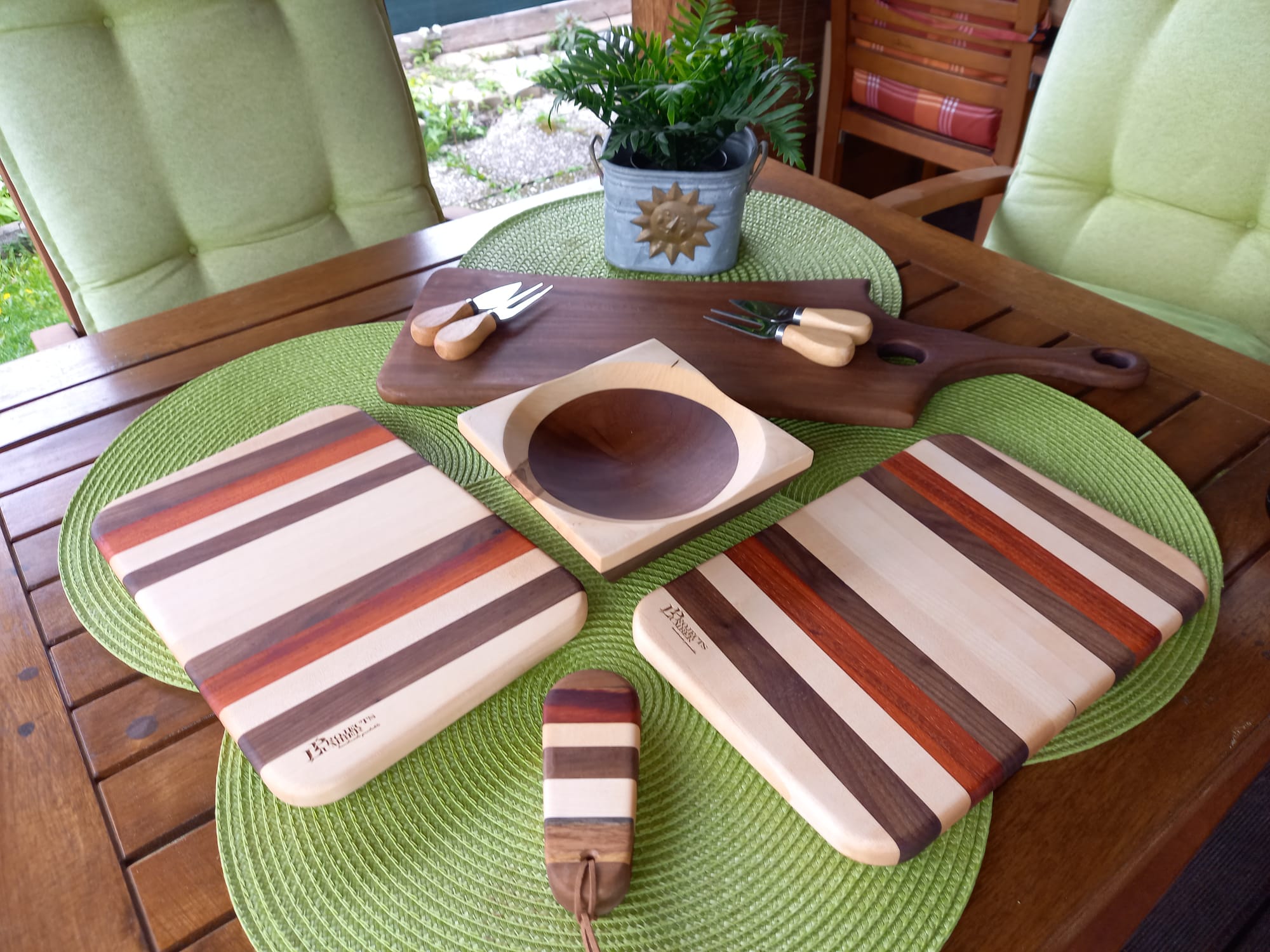 Zusätzlich bieten wir die Option von eingefrästen Intarsien, die gezielt in das Holz eingearbeitet werden. So entsteht ein ganz individuelles Design, das Ihre Kreativität widerspiegelt und perfekt für besondere Anlässe geeignet ist. Entdecken Sie die Vielfalt und Qualität unserer handgefertigten Holzprodukte und machen Sie jedes Essen zu einem besonderen Erlebnis!